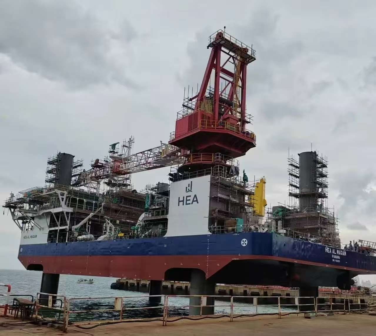 9月27日,TYPE3 PRO第二座自升式海上作業(yè)支持平臺下水后,經(jīng)過升降系統(tǒng)調(diào)試,四條樁腿平穩(wěn)扎進海底實現(xiàn)了平臺站樁,隨后開展了平臺樁腿接長工作。